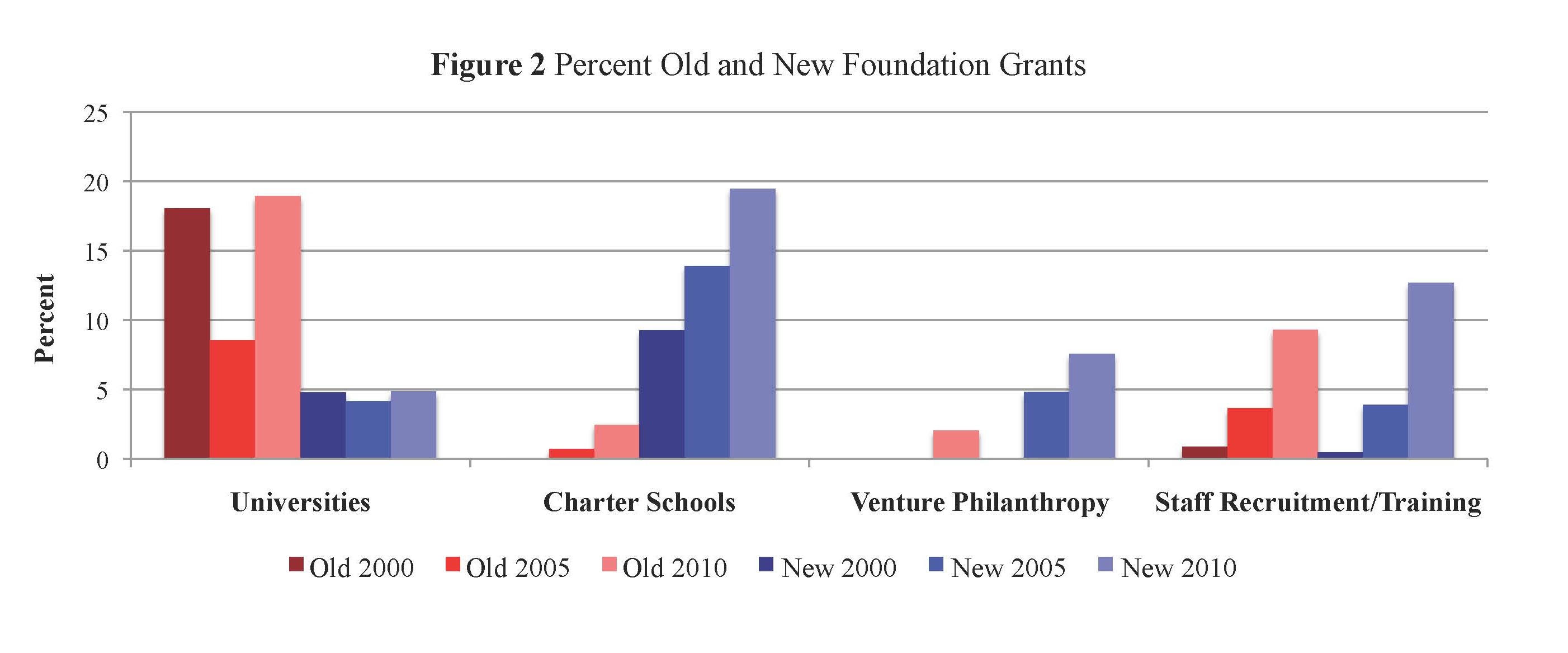 Figure 2 identifies the percent of old and new foundation funds going to different recipients in each year—old foundations are in red, new foundations are in blue, and each moves from darkest in 2000 to lightest in 2010. The left-most cluster shows that old foundations gave substantially more to university-based programs and research than did new foundations. The second grouping indicates that charter schools were a primary beneficiary of new foundations but not old foundations. Further, although old foundations grew their charter granting each year, new foundations increased their charter funding much more in each period. NewSchools Venture Fund (NSVF) typifies the “venture philanthropy” group comprised of grantees applying venture capital principles to education reform. NSVF, for example, provides seed money to organizations like charter schools, alternative teacher certification programs, education technology firms, and others operating outside traditional education institutions. Venture philanthropy funding also appears to be largely a feature of new foundation granting, and its rapid growth suggests an emergent area of differentiation between new and old philanthropies. Finally, the “staff recruitment/training” category is one where new and old foundations seemingly mirror each other. Patterns in growth are very similar, though new foundations did dedicate more funds to these areas in 2010. Qualitatively, however, differences exist. New foundations almost exclusively fund groups like Teach for America (TFA), which develop their own training in lieu of more traditional university-based programs. Old foundation grants split between alternative programs like TFA and those that utilize university-based preparation.