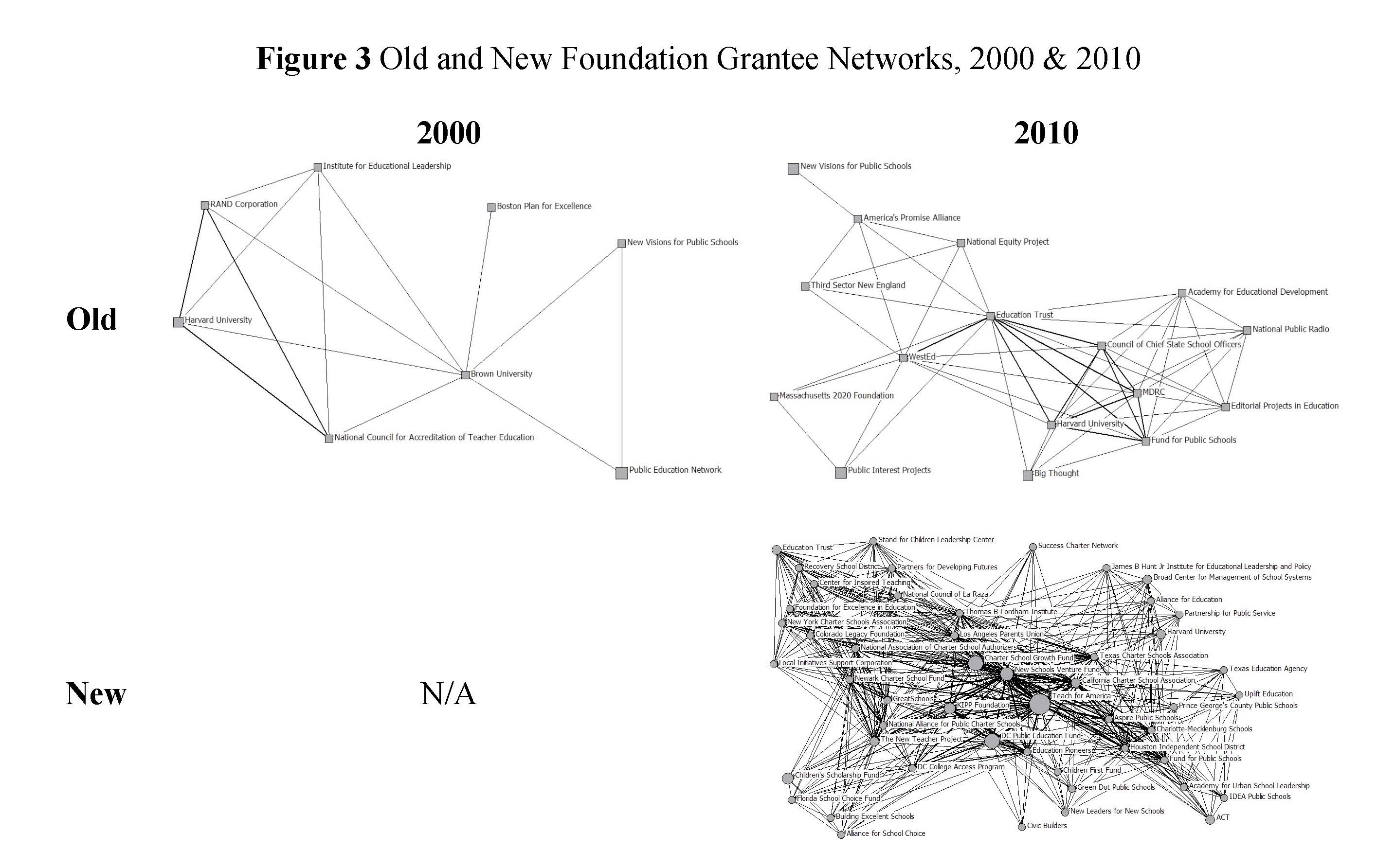 In 2000, no new foundation grantee network existed because not enough recipients met criteria for inclusion. A network did exist for old foundation grantees, split primarily into one cluster for teacher/administrator development grantees and another for organizations associated with the Annenberg Challenge.